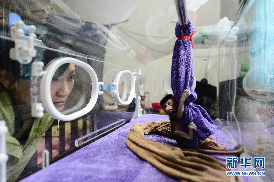 陳蓉在植物園內照看剛誕生幾天的“孤兒”小恒河猴(9月17日攝)。新華社記者劉金海攝
